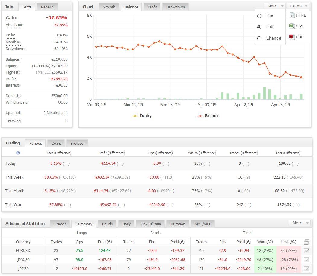 nekem ezek az eredmenyeim. Az uj, 2.96-os verzional az agressziv szetet futtatom AdmiralMarkets demon. Marciusban futtattam DJ-on es EURUSD-n, de csak egy par hetig, azota csak DAX-on. Sikerül valakinek profitosan futtatni a robotot ebben az idöszakban, azaz marcius-aprilistol?